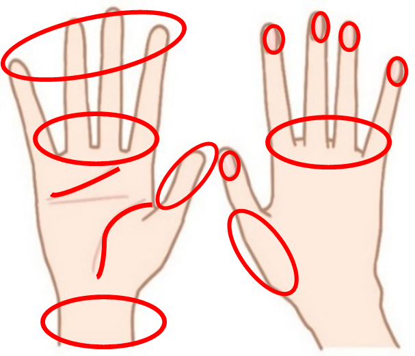 A. 手洗い不足になりやすい箇所は指先、爪と皮膚の間、手のひらのしわ、親指の付け根、指の間、手首です。