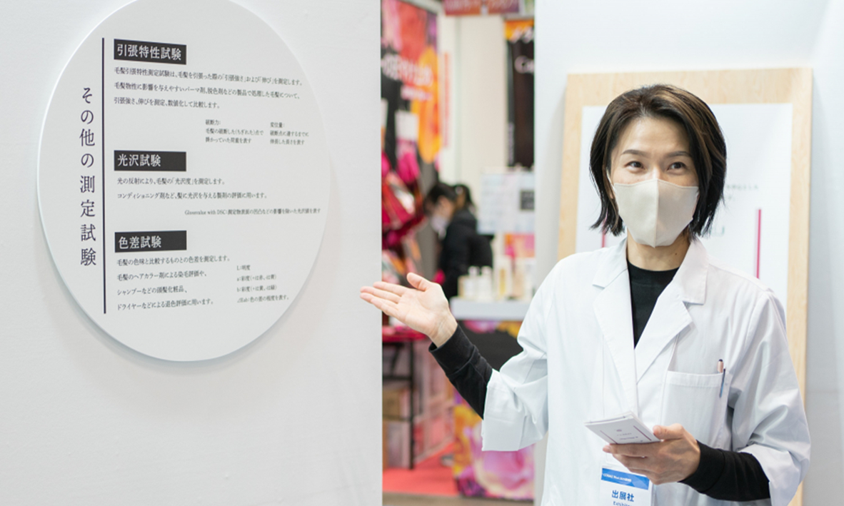 毛髪評価試験は事業として行っている試験機関の数が少なく、試験もまだまだ知られていません。これまで美容師さんやヘアケア製品の開発者の方が感覚や経験則で判断してきた指標を数値化し、誰にでもわかるデータにできるということを伝えるため、展示会への出展を強化しています。