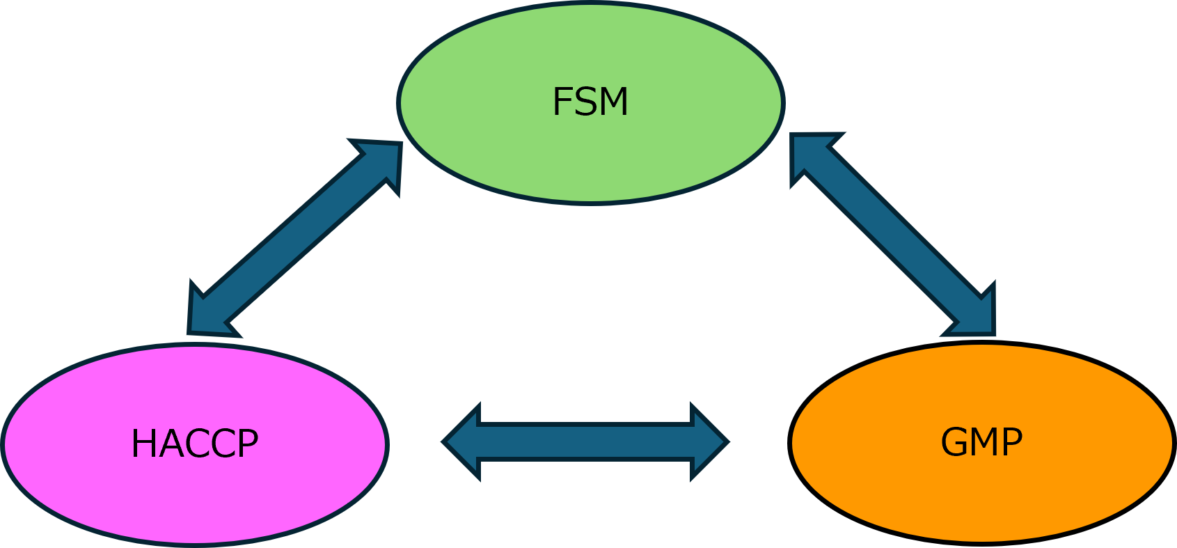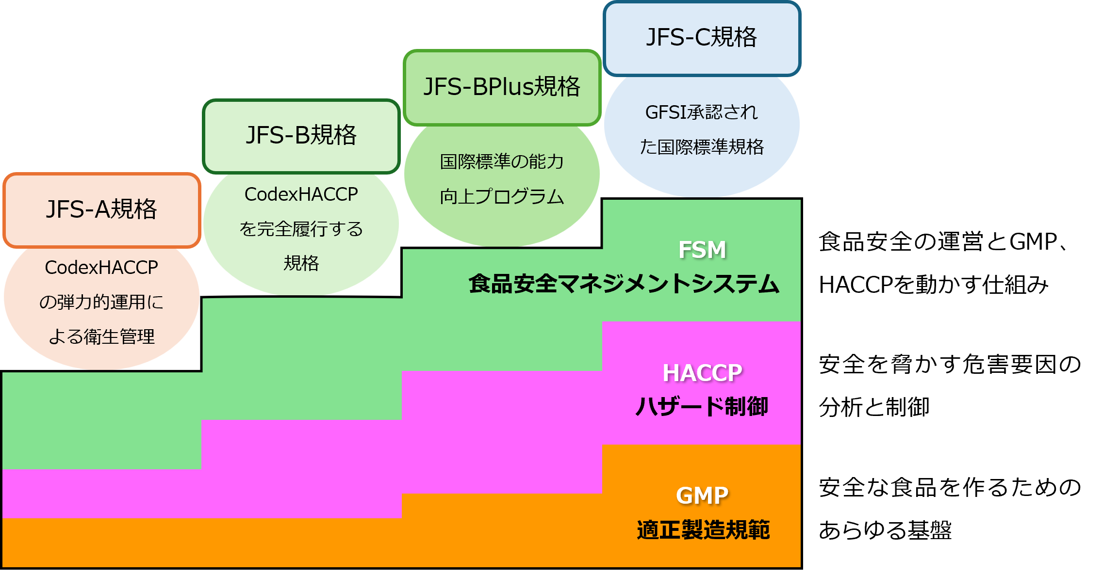 - JFS規格は、食品安全マネジメント(FSM)、ハザード制御(HACCP)、適正製造規範(GMP)の3要素で構成され、それぞれが独立して機能するのではなく、相互的に影響を及ぼしております。
